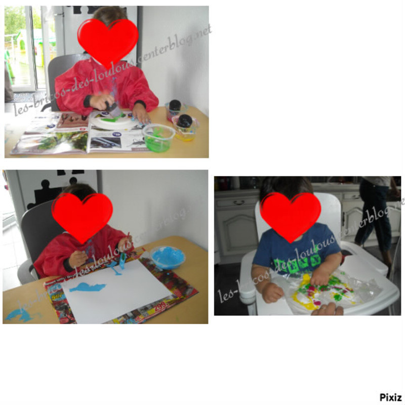 Lundi il faisait un temps épouvantable, il a plu de cordes toutes la journée ! Alors j'ai mis les 2 loulous à contribution pour réaliser un joli tableau marin ! Eva et Jacques ont peint chacun un fond bleu, Eva a peint une assiette en carton avec des tampons pochoirs pour faire le bateau et le poisson, Jacques quant à lui l'a fait en peinture propre, car c'est un petit garçon qui aime manger tout ce qu'il a entre les mains et il a voulu manger le pinceau plein de peinture bleue !